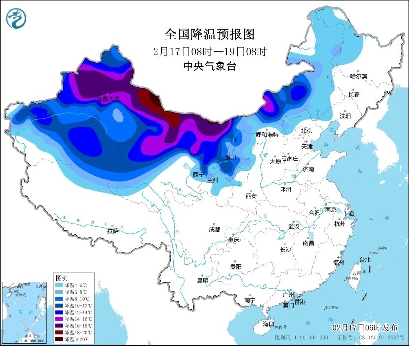 預(yù)計,2月17日08時至19日08時,新疆大部、內(nèi)蒙古中西部、甘肅大部、寧夏、青海北部等地將先后降溫6~12℃,其中,新疆北部、內(nèi)蒙古西部、甘肅河西等地部分地區(qū)降溫可達(dá)12~20℃,局地20℃以上。
