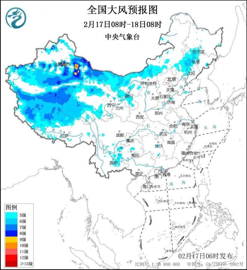 2月18日08時至19日08時,新疆南疆盆地、內(nèi)蒙古西部、青海西南部、西藏西部、甘肅西部等地將有5~6級、陣風(fēng)7~9級的大風(fēng);渤海、渤海海峽、黃海大部海域、東海北部海域?qū)⒂?~8級、陣風(fēng)9級的大風(fēng)。