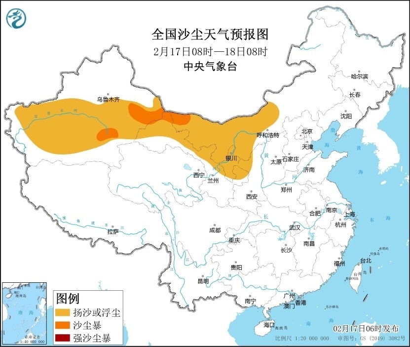 受冷空氣大風(fēng)影響,預(yù)計2月17日08時至18日08時,新疆東部和南疆盆地、內(nèi)蒙古中西部、甘肅北部、寧夏大部、陜西西北部等地的部分地區(qū)有揚沙或浮塵天氣,新疆東部和南疆盆地東南部、內(nèi)蒙古西部、甘肅北部等局地有沙塵暴。