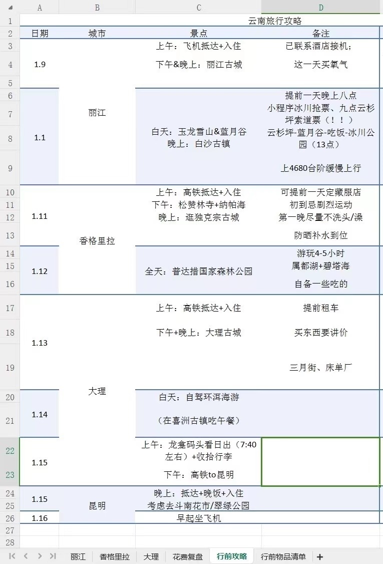這個冬天去云南旅行前,周玫將自己的計劃制成一張excel表格,具體到每個市、每個景點、每種美食……旅行結束后,她還對云南游的具體執(zhí)行情況進行了復盤總結,在社交平臺上分享給她的“電子驢友”。