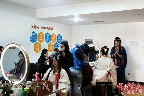 河北省邯鄲市叢臺公園附近一家旅拍館內(nèi),游客排隊體驗漢服妝造。焦晶嫻/攝