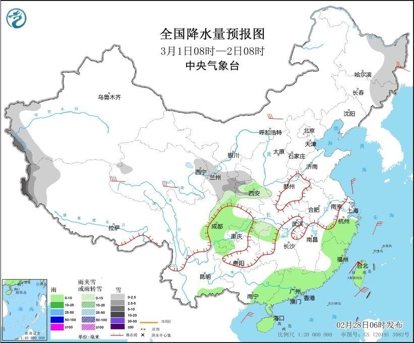全國降水量預(yù)報(bào)圖(2月28日08時(shí)-29日08時(shí))