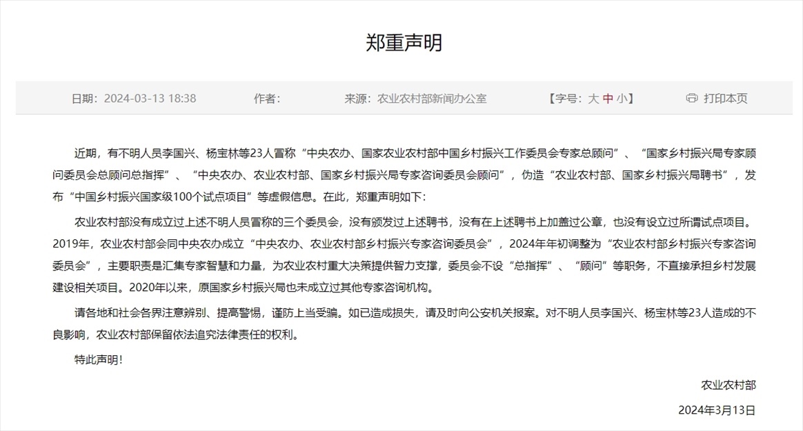 ·農(nóng)業(yè)農(nóng)村部鄭重聲明:沒有成立過不明人員冒稱的“中央農(nóng)辦、國家農(nóng)業(yè)農(nóng)村部中國鄉(xiāng)村振興工作委員會專家總顧問”、“國家鄉(xiāng)村振興局專家顧問委員會總顧問總指揮”、“中央農(nóng)辦、農(nóng)業(yè)農(nóng)村部、國家鄉(xiāng)村振興局專家咨詢委員會顧問”三個委員會,沒有頒發(fā)過上述聘書,沒有在上述聘書上加蓋過公章,也沒有設(shè)立過所謂試點(diǎn)項目。