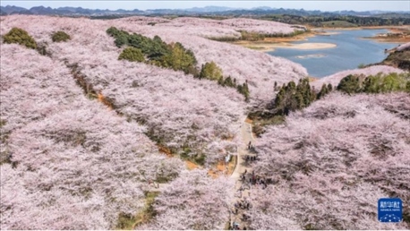 近日,貴州省貴安新區(qū)櫻花園內(nèi)的2.4萬(wàn)畝櫻花迎來(lái)盛花期,花團(tuán)錦簇,春意盎然,吸引各地游客前來(lái)賞花游玩。?