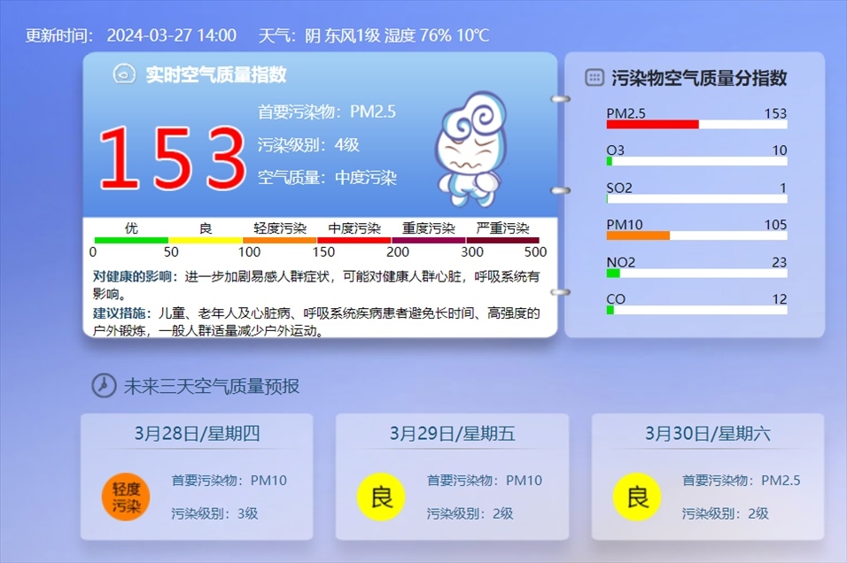 建議措施:兒童、老年人及心臟病、呼吸系統(tǒng)疾病患者避免長時間、高強(qiáng)度的戶外鍛煉,一般人群適量減少戶外運動。