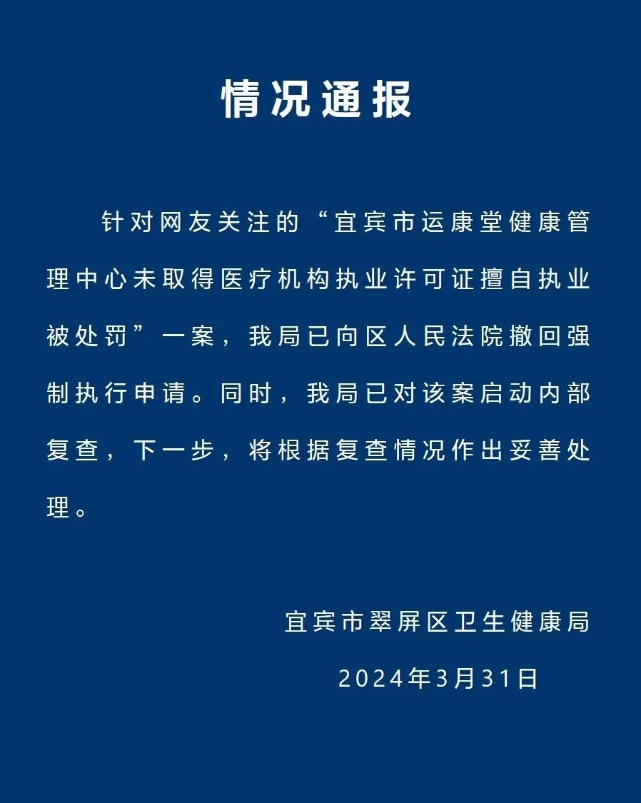 央視網(wǎng)消息:據(jù)宜賓市翠屏區(qū)衛(wèi)生健康局發(fā)布情況通報,3月31日,針對網(wǎng)友關(guān)注的“宜賓市運康堂健康管理中心未取得醫(yī)療機構(gòu)執(zhí)業(yè)許可證擅自執(zhí)業(yè)被處罰”一案,宜賓市翠屏區(qū)衛(wèi)生健康局已向區(qū)人民法院撤回強制執(zhí)行申請。同時,宜賓市翠屏區(qū)衛(wèi)生健康局已對該案啟動內(nèi)部復(fù)查,下一步,將根據(jù)復(fù)查情況作出妥善處理。