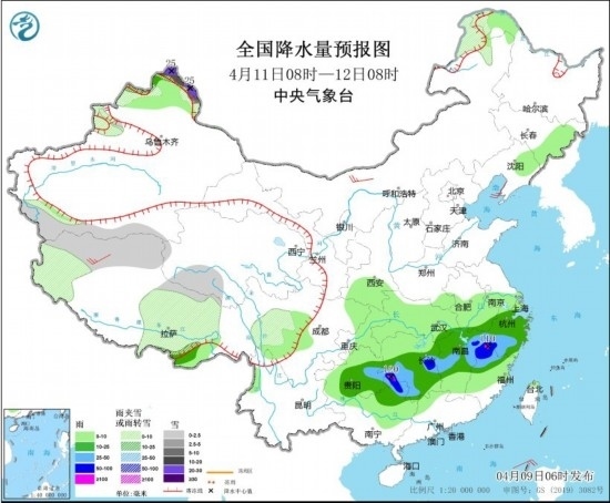 4月11日08時至12日08時,新疆北疆北部、內蒙古東北部、黑龍江西北部、西藏西部和中北部、青海南部、川西高原等地部分地區(qū)有小到中雪或雨夾雪,其中,新疆北疆北部高海拔地區(qū)有大到暴雪,局地大暴雪(20~25毫米)。貴州東部、廣西北部、江南大部的部分地區(qū)有中到大雨,其中,湖南東部和西南部、廣西北部、江西東北部、浙江西南部、福建西北部等地部分地區(qū)有暴雨或大暴雨(100~120毫米)。內蒙古西北部、西藏西部等地部分地區(qū)有4~5級風。