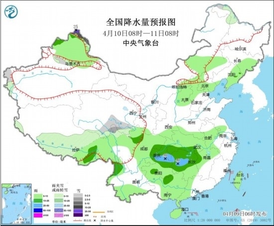 4月10日08時至11日08時,新疆北疆北部、黑龍江西北部、西藏中部和北部、青海東南部、川西高原北部等地部分地區(qū)有小到中雪或雨夾雪,其中,新疆北疆北部高海拔地區(qū)有大到暴雪,局地大暴雪(20~25毫米)。內蒙古東部、華北北部、東北地區(qū)東部、新疆北部、西藏東部、四川盆地大部、重慶、江淮西部、江漢、江南北部和西部、貴州大部、廣西大部、云南西部和南部、海南島、臺灣島等地部分地區(qū)有小到中雨,其中,重慶東南部、貴州北部、湖南中西部等地部分地區(qū)有大雨(25~40毫米)。新疆東部部分地區(qū)有6~7級風。