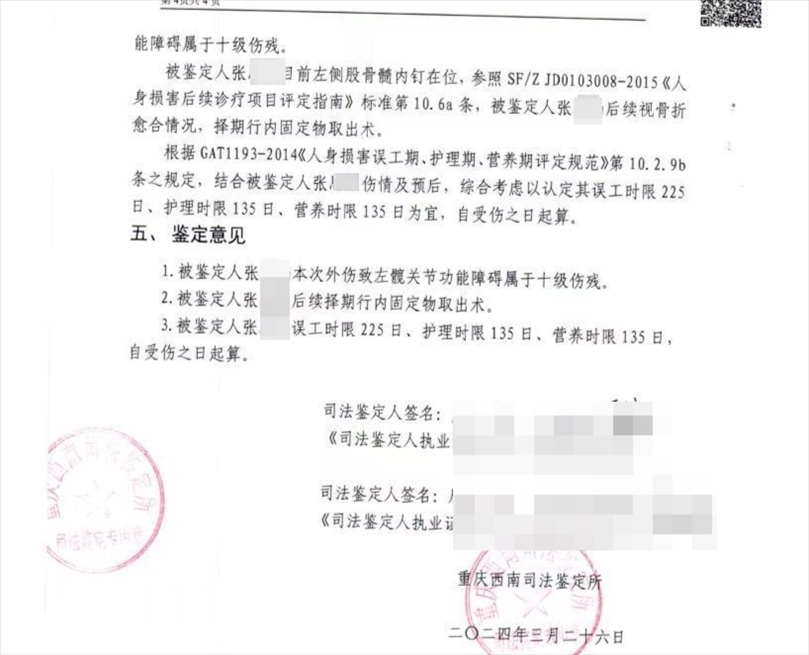 張同學(xué)介紹,第一次開庭主要是確定鑒定機構(gòu)。張同學(xué)提供的司法鑒定書顯示,2024年3月26日,重慶西南司法鑒定所鑒定認為,她本次外傷致左髖關(guān)節(jié)功能十級傷殘。其左側(cè)股骨髓內(nèi)釘在位,后續(xù)視骨折愈合情況,擇期行內(nèi)固定物取出術(shù)。