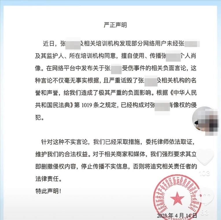 紅星新聞注意到,遠倫舞蹈帳號2023年2023年4月曾發(fā)布一則聲明。落款為重慶高新技術(shù)產(chǎn)業(yè)開發(fā)區(qū)新遠倫教育培訓(xùn)學(xué)校有限公司(下稱遠倫培訓(xùn)學(xué)校)。聲明稱,近日,張某涵及相關(guān)培訓(xùn)機構(gòu)發(fā)現(xiàn)部分網(wǎng)絡(luò)用戶未經(jīng)張某涵及其監(jiān)護人、所在培訓(xùn)機構(gòu)同意,擅自使用、傳播張某涵個人肖像。在網(wǎng)絡(luò)平臺中發(fā)布關(guān)于受傷事件的相關(guān)負面言論,這種言論不僅毫無事實根據(jù),且嚴重詆毀了張某涵及相關(guān)機構(gòu)的名譽和聲譽,給公司造成了極其嚴重的負面影響,已經(jīng)構(gòu)成對張某涵肖像權(quán)的侵犯。