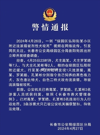 ·長春警方通報3人指使烈性犬咬死流浪貓:已行政處罰。