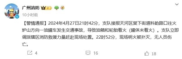 中新網(wǎng)4月28日電 據(jù)廣州消防微博消息,2024年4月27日21時(shí)42分,支隊(duì)接報(bào)天河區(qū)棠下街道科韻路口往火爐山方向一油罐車發(fā)生交通事故,導(dǎo)致油箱和輪胎著火(罐體未著火)。支隊(duì)立即調(diào)派轄區(qū)消防救援力量趕赴現(xiàn)場(chǎng)處置。22時(shí)52分,現(xiàn)場(chǎng)明火被撲滅,無(wú)人員傷亡。