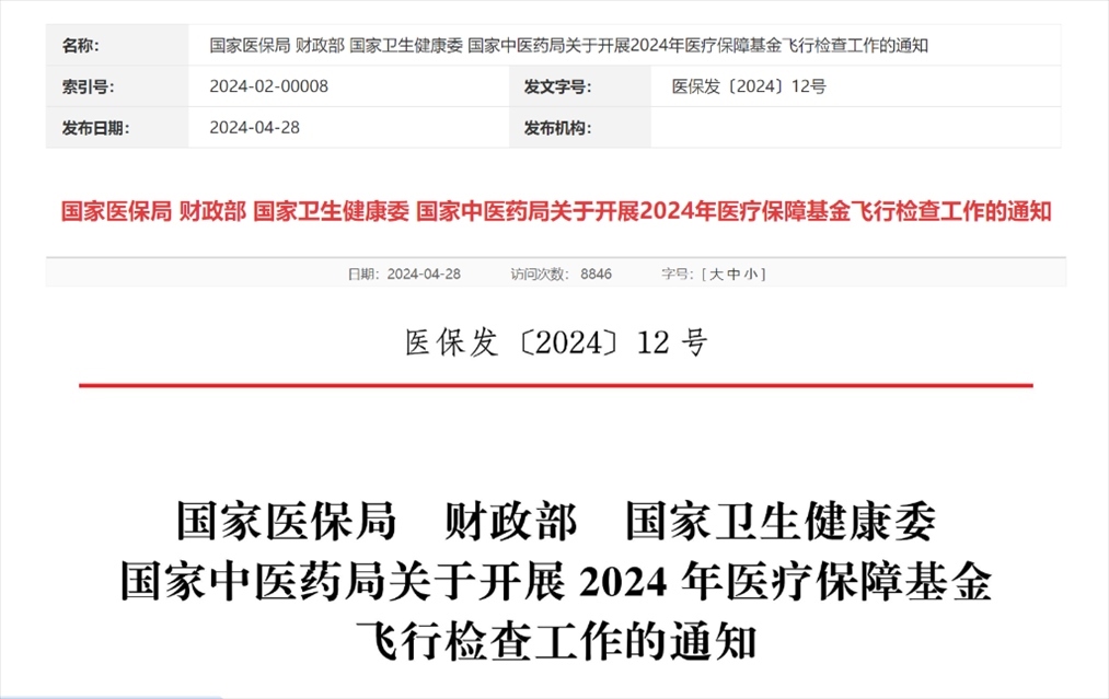 這項《關(guān)于開展2024年醫(yī)療保障基金飛行檢查工作的通知》由國家醫(yī)保局、財政部、國家衛(wèi)生健康委、國家中醫(yī)藥局聯(lián)合印發(fā)。