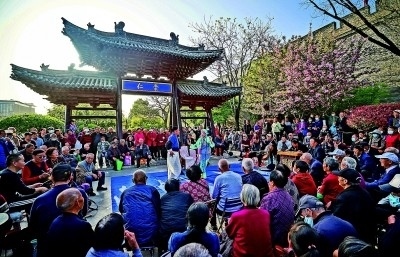 眾多市民圍觀(guān)欣賞秦腔愛(ài)好者的表演。