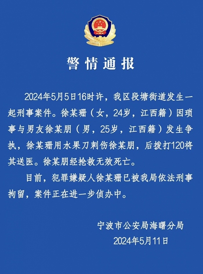央視網(wǎng)消息:5月11日,寧波市公安局海曙分局發(fā)布警情通報,5月5日16時許,海曙區(qū)段塘街道發(fā)生一起刑事案件。徐某珊(女,24歲,江西籍)因瑣事與男友徐某朋(男,25歲,江西籍)發(fā)生爭執(zhí),徐某珊用水果刀刺傷徐某朋,后撥打120將其送醫(yī)。徐某朋經(jīng)搶救無效死亡。目前,犯罪嫌疑人徐某珊已被海曙分局依法刑事拘留,案件正在進一步偵辦中。