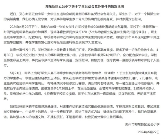 ·鄭州一小學(xué)生短跑暈倒后離世,學(xué)校通報系自主報名賽前無不適。