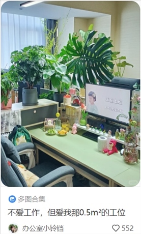 “按個(gè)人喜好裝修的工位可以讓年輕人在這一方小天地里可以獲得短暫的歸屬感與安全感,將目之所及之處都變成自己想要的樣子,令他們?cè)诳陀^條件有限的情況下盡可能讓自己感到舒適,也更容易從工作中感到幸福?!庇诠馊鸱治稣f(shuō)。