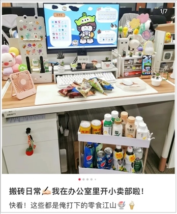 除此之外,還有人在工位養(yǎng)魚、寄居蟹、水母、蟑螂等寵物;有人在工位開起了“小賣部”,吃的喝的樣樣俱全;有人環(huán)繞工位放上了靠墊、坐墊、抱枕、毛毯、沙發(fā)椅,保證隨時(shí)可以躺、靠、臥,主打一個(gè)舒適。