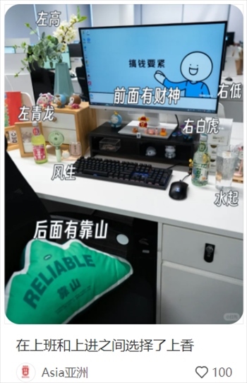 有網(wǎng)友分享工位的風(fēng)水大有講究:擺滿綠植象征欣欣向榮,整體布置左高右低;后背有靠,面不對(duì)門;左靠窗,水杯放左邊,寓意風(fēng)生水起;雜物放桌面左邊,右邊越簡(jiǎn)約越好。