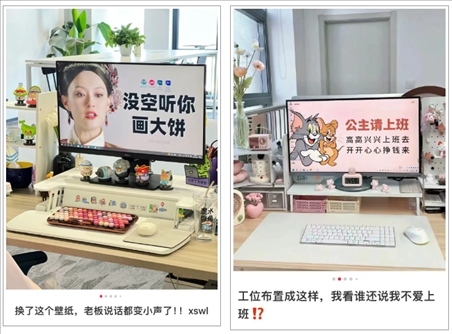 “沒(méi)空聽你畫大餅”“公主請(qǐng)開心上班”,調(diào)侃吐槽、加油鼓勁的電腦壁紙隨處可見。
