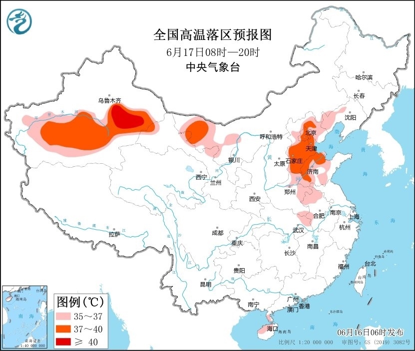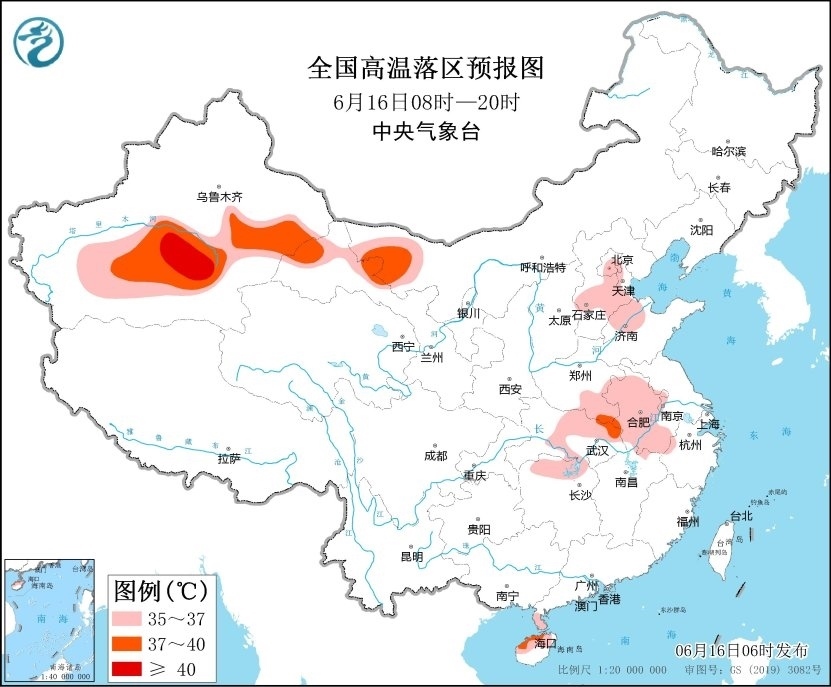16日,華北、黃淮等地高溫強度將有所減弱、范圍將有所減小,但預計6月16日白天,內(nèi)蒙古西北部、新疆南疆盆地和東部、甘肅河西、河北中部、北京、山東西北部、河南東部和南部、安徽、湖北東北部、海南島北部等地仍有35~36℃高溫天氣,其中,內(nèi)蒙古西北部、新疆南疆盆地和東部、河南東南部等地部分地區(qū)最高氣溫37~39℃,新疆南疆盆地局地可達40℃以上。