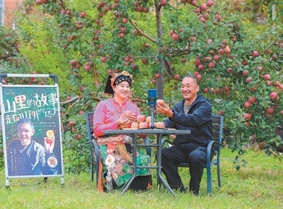 四川省小金縣沃日鎮(zhèn)木欄村,電商主播同果農一起直播賣蘋果。嚴易程攝(人民視覺)