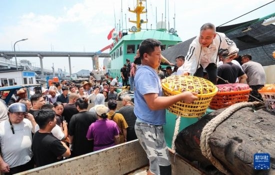 當(dāng)日,在浙江省舟山市普陀區(qū)舟山國(guó)際水產(chǎn)城碼頭,出海的漁船歸來,商戶們聞“鮮”而至。工人把卸下來的梭子蟹運(yùn)往水產(chǎn)城內(nèi),準(zhǔn)備銷往各地市場(chǎng)。