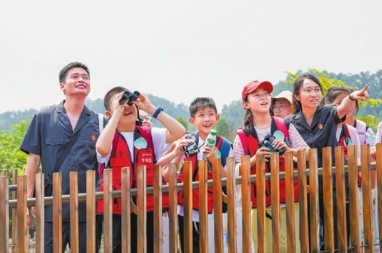 圖①:干警指引學生們觀察稀有鳥類。