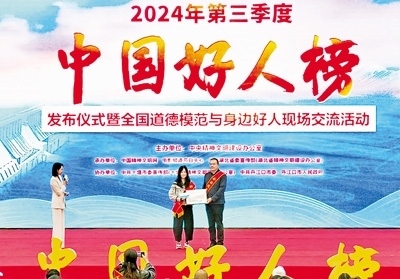 30多年堅(jiān)守海上救援的“漁家子弟”董建海,數(shù)九寒天跳入冰窟救人獻(xiàn)出生命的普通村民高元嶺,自愿守護(hù)烈士英靈43載的退伍老兵顧平,犧牲在防汛一線的90后基層干部李東,21年不離不棄照料患病親人的好兒媳王秀杰……11月12日,由中央精神文明建設(shè)辦公室主辦的2024年第三季度“中國(guó)好人榜”發(fā)布儀式暨全國(guó)道德模范與身邊好人現(xiàn)場(chǎng)交流活動(dòng)在湖北省十堰市舉辦,經(jīng)各地推薦、網(wǎng)友評(píng)議和專(zhuān)家評(píng)審等環(huán)節(jié),共有152人(組)助人為樂(lè)、見(jiàn)義勇為、誠(chéng)實(shí)守信、敬業(yè)奉獻(xiàn)、孝老愛(ài)親身邊好人光榮上榜。