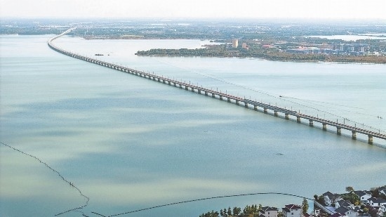 11月23日,蘇州吳江區(qū),滬蘇湖高鐵試運行列車跨過元蕩。 袁新宇 周悅磊 攝 (視覺江蘇網(wǎng)供圖)