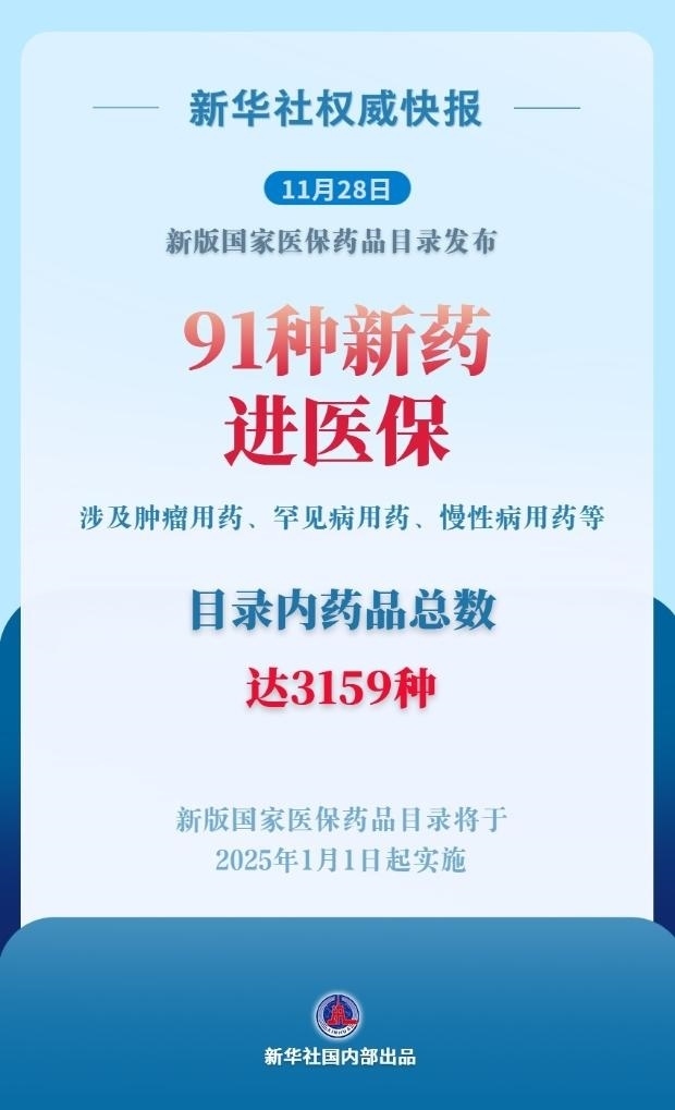 自成立以來,國家醫(yī)保局已連續(xù)7年開展醫(yī)保藥品目錄調整工作。本次調整后,目錄內藥品總數(shù)將增至3159種,腫瘤、慢性病、罕見病、兒童用藥等領域的保障水平得到提升。新版國家醫(yī)保藥品目錄將于2025年1月1日起實施。