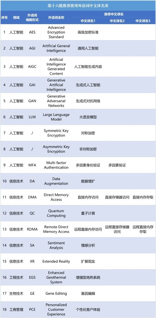 記者12月10日從教育部獲悉,近日,外語中文譯寫規(guī)范部際聯(lián)席會(huì)議專家委員會(huì)審議通過第十六批18組推薦使用外語詞中文譯名。本次擬推薦使用的外語詞中文譯名,均為與人工智能、信息技術(shù)等相關(guān)的詞條。