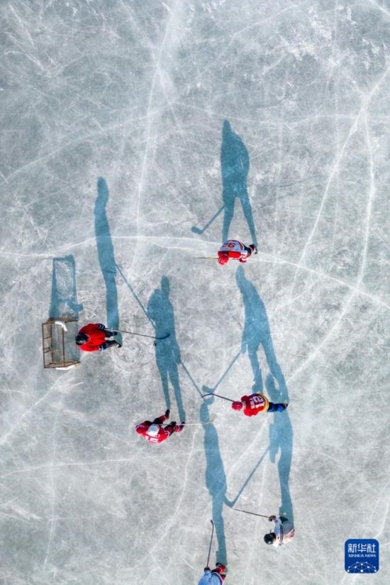 1月18日,人們在哈爾濱市丁香公園內(nèi)打冰球(無人機(jī)照片)。