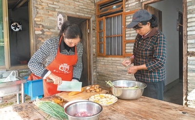 培田村老年食堂廚房?jī)?nèi),周雪梅(左)正在備菜。