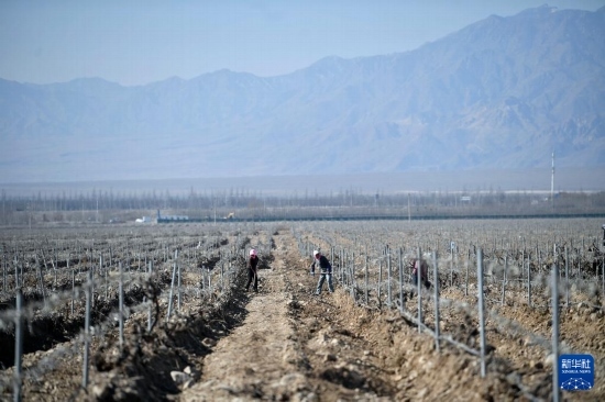 3月18日,工人在賀蘭山東麓釀酒葡萄種植基地為葡萄展藤。
