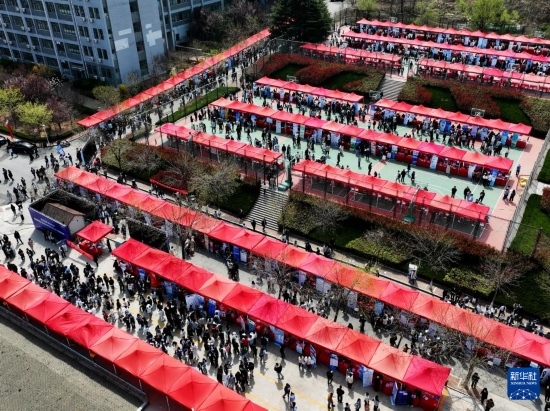 這是4月11日在山東青島科技大學拍攝的2025年春季綜合類大型雙選會招聘活動現(xiàn)場(無人機照片)。