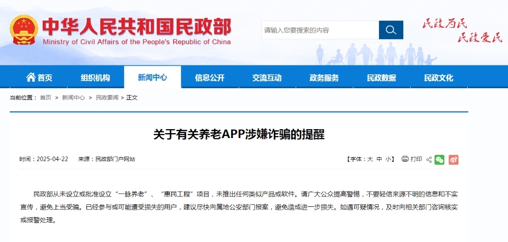 4月22日,民政部發(fā)布公告表示,民政部從未設(shè)立或批準設(shè)立“一脈養(yǎng)老”“惠民工程”項目,未推出任何類似產(chǎn)品或軟件。請廣大公眾提高警惕,不要輕信來源不明的信息和不實宣傳,避免上當受騙。已經(jīng)參與或可能遭受損失的用戶,建議盡快向?qū)俚毓膊块T報案,避免造成進一步損失。如遇可疑情況,及時向相關(guān)部門咨詢核實或報警處理。(記者朱高祥)