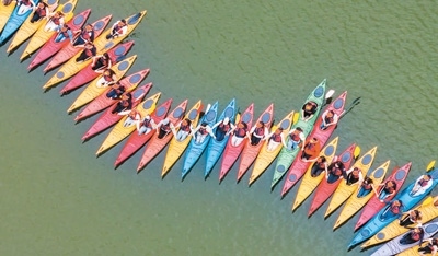 4月25日,重慶市南川區(qū)黎香湖鎮(zhèn)黎香湖皮劃艇基地,游客們?cè)诤矬w驗(yàn)水上運(yùn)動(dòng)樂(lè)趣。據(jù)介紹,“五一”假期期間該皮劃艇基地已預(yù)約滿員。