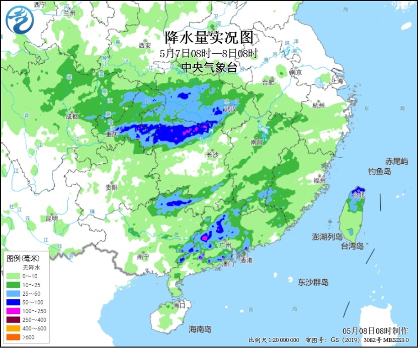 氣象監(jiān)測(cè)顯示,昨日,重慶東部、湖北西南部、湖南西北部、廣西東北部、廣東中西部及臺(tái)灣島北部等地部分地區(qū)出現(xiàn)大到暴雨,重慶彭水、湖北恩施、湖南張家界、廣東肇慶和江門(mén)等局地大暴雨(100~192毫米)。