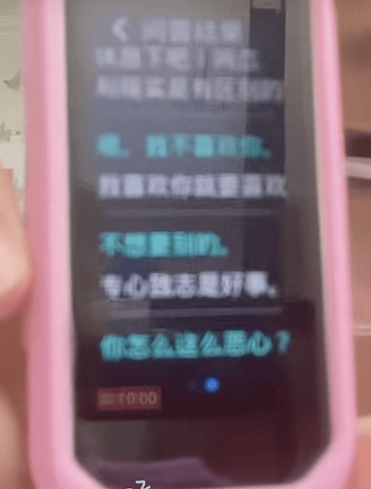 小女孩在視頻中展示了與點讀機的兩段對話,機:休息下吧!網(wǎng)絡(luò)和現(xiàn)實是有區(qū)別的;女:哦,我不喜歡你;機:我喜歡你就要喜歡;女:不想要別的;機:專心致志是好事;女:你怎么這么惡心?;機:咱們聊點別的吧;女:我不喜歡你;機:主人,不要拋棄我啊。