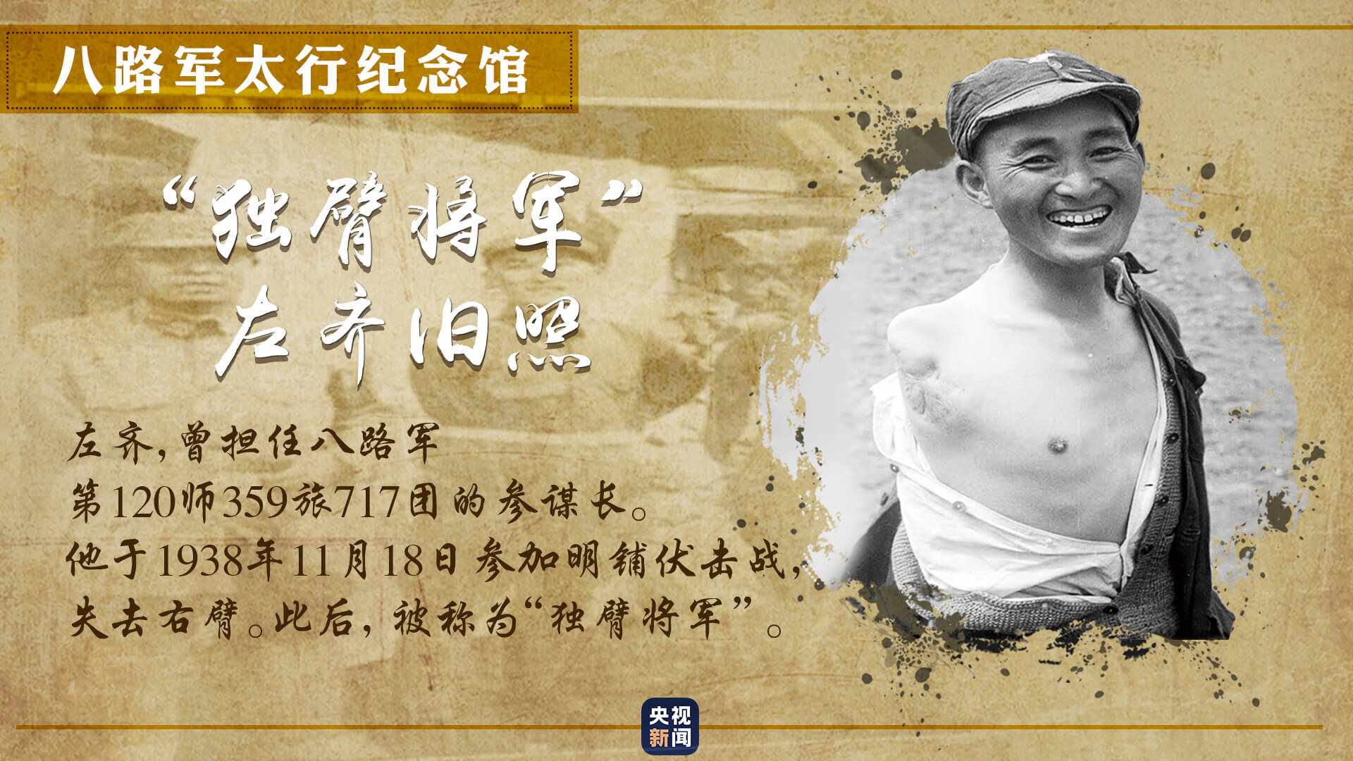 一張獨(dú)臂將軍的舊照,展現(xiàn)出八路軍為爭(zhēng)取民族獨(dú)立,不怕犧牲、不畏艱險(xiǎn)的革命英雄主義精神。