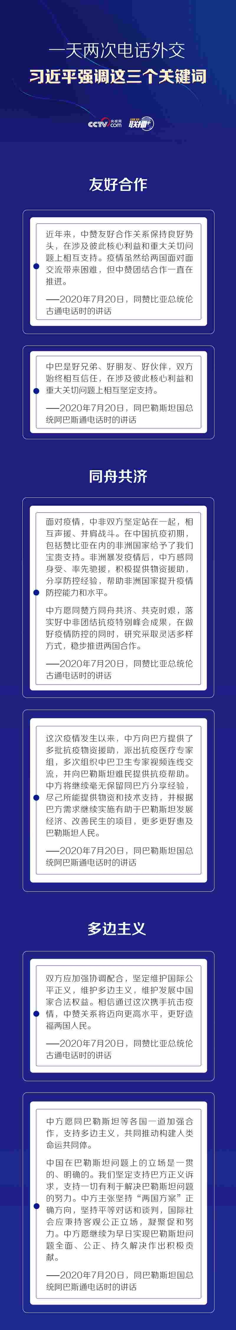 7月20日晚,習(xí)近平主席分別同贊比亞總統(tǒng)倫古和巴勒斯坦國總統(tǒng)阿巴斯通電話。通話中,習(xí)近平主席肯定了與兩國的相互信任和支持,主張同舟共濟、共克時艱,強調(diào)堅定維護國際公平正義,維護多邊主義。