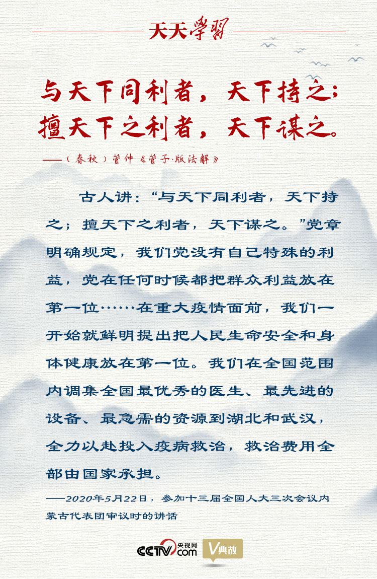 “不惜一切代價(jià)!”2020年5月22日,習(xí)近平總書記參加十三屆全國人大三次會(huì)議內(nèi)蒙古代表團(tuán)審議,在談及保護(hù)人民生命安全和身體健康時(shí)擲地有聲地說。他在此引用了“與天下同利者,天下持之;擅天下之利者,天下謀之”這句古語,強(qiáng)調(diào)我們黨沒有自己特殊的利益,黨在任何時(shí)候都把群眾利益放在第一位。這是我們黨作為馬克思主義政黨區(qū)別于其他政黨的顯著標(biāo)志。