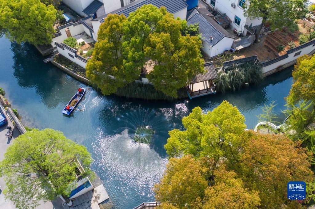 在浙江省長興縣龍山街道渚山村,保潔人員進(jìn)行日常河道護(hù)理巡查(2020年4月9日攝,無人機(jī)照片)。新華社記者徐昱攝