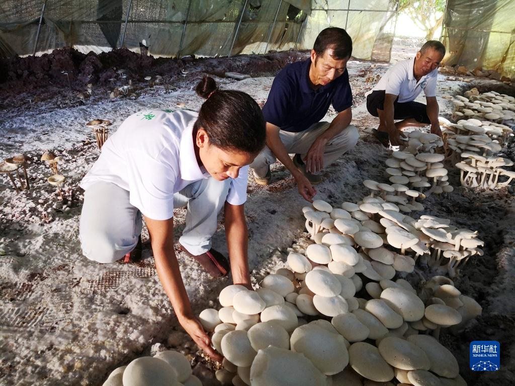 2018年6月12日,在斐濟(jì)楠迪,中國專家和當(dāng)?shù)毓蛦T檢查菌菇生長情況。新華社記者張永興攝