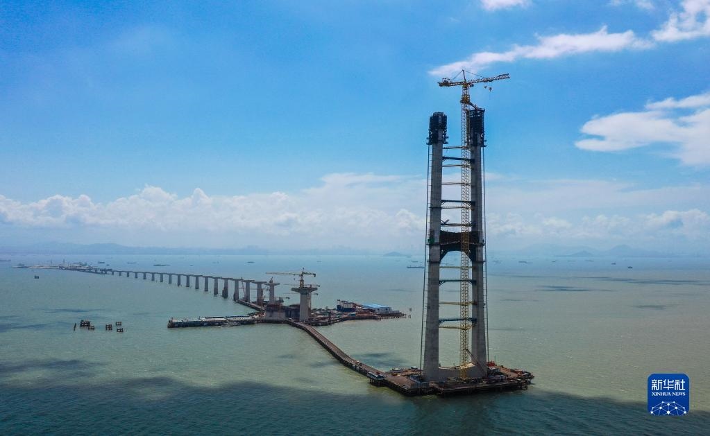 由中交二航局承建的深中通道伶仃洋大橋東索塔(7月1日攝)。新華社記者劉大偉攝