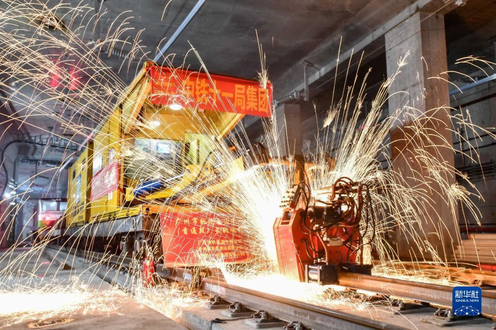 中鐵十一局軌道焊機(jī)在焊接廣州地鐵18號線首通段最后一個鋼軌接頭(4月20日攝)。新華社記者劉大偉攝