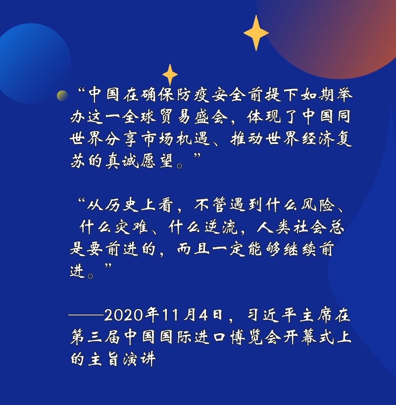 突如其來(lái)的新冠肺炎疫情給各國(guó)帶來(lái)嚴(yán)重沖擊,也給世界經(jīng)濟(jì)帶來(lái)重創(chuàng)。在2020年舉行的第三屆進(jìn)博會(huì)上,習(xí)近平主席誠(chéng)摯的話語(yǔ),為世界注入強(qiáng)大信心——