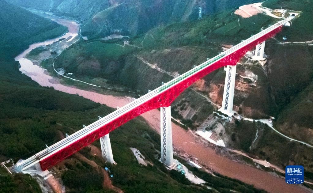 中老鐵路首發(fā)列車駛過中國云南省元江哈尼族彝族傣族自治縣境內的元江雙線特大橋(12月3日攝,無人機照片)。新華社記者王冠森攝