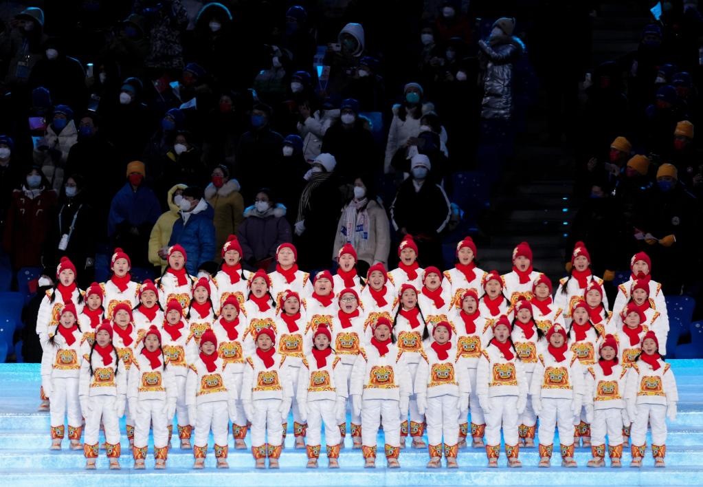 2月4日晚,第二十四屆冬季奧林匹克運(yùn)動(dòng)會(huì)開(kāi)幕式在北京國(guó)家體育場(chǎng)舉行。圖為孩子們演唱奧林匹克會(huì)歌。新華社記者李安攝
